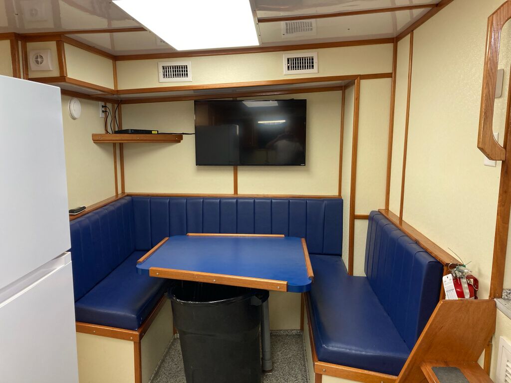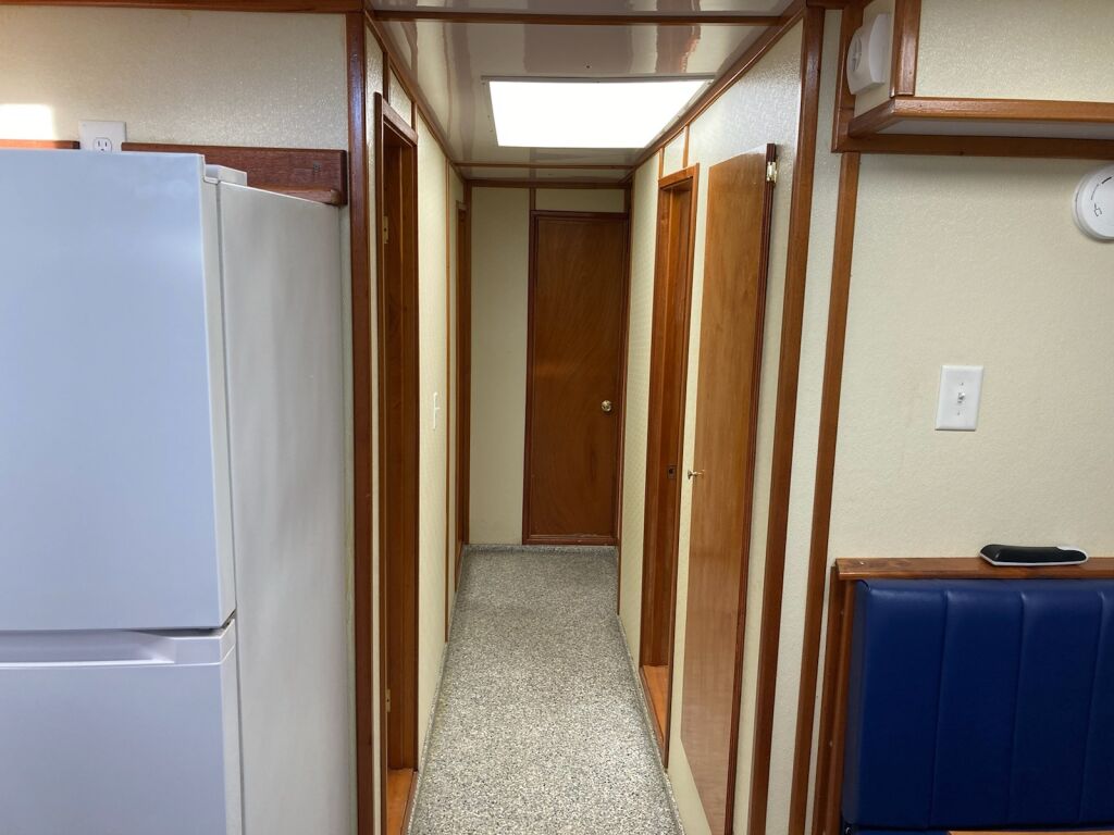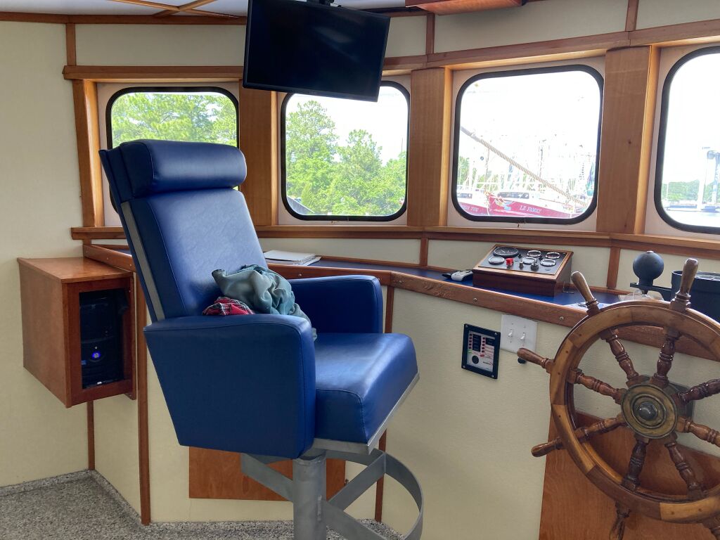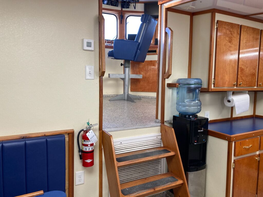 The deckhouse is constructed of 1/4" plate, flat bar and angle framed, fiberglass insulated and ceiled throughout with fiberglass wall paneling, fiberglass overhead panels, Spanish Cedar cabinets and trim and Targinol epoxy flooring. Beginning forward is the raised pilothouse fitted with a formica covered console with access panels beneath, port and starboard exit watertight doors, two (2) pedestal type pilot chairs and gasket fitted 1/4" tempered safety glass windows. Lighting is AC LED and DC incandescent. AC & DC ships service electrical panels are located port side aft pilothouse. Forepeak escape access is located beneath the pilothouse to deckhouse steps. Aft of and four (4) steps down from the pilothouse on the starboard side is the galley equipped with a Whirlpool 4—burner 240 VAC electric stove with Nutone 120 VAC vent/ light; Hamilton Beach 120 VAC microwave, 120 VAC refrigerator and a Primo 120 VAC bottled water cooler/ dispenser. A double basin stainless steel sink is fitted into a formica covered counter with ample storage cabinets provided above and beneath. Port side aft of the pilothouse is arranged a formica covered crew mess table with built in upholstered seat lockers. Starboard side aft of the galley are arranged fore and aft staterooms, the forward fitted with one (1) bunk and the aft fitted with four (4) bunks. Both staterooms are fitted with adequate storage lockers and drawer space. Port side aft of the diffing table is a water closet equipped with toilet, shower stall and lavatory/ vanity. In the aft port corner of the deckhouse is the engine room access companionway and exit watertight door to the aft deck. Deckhouse is equipped with a R.S. Price & Son, 5—ton capacity, water cooled heat pump type 240 VAC central heating and air conditioning system.