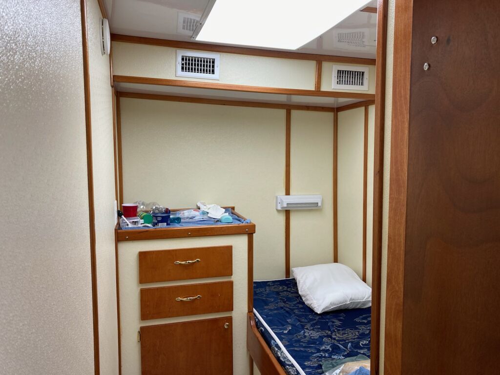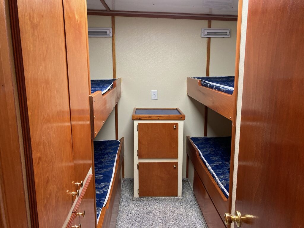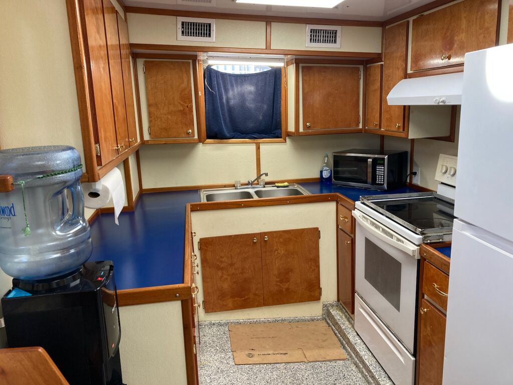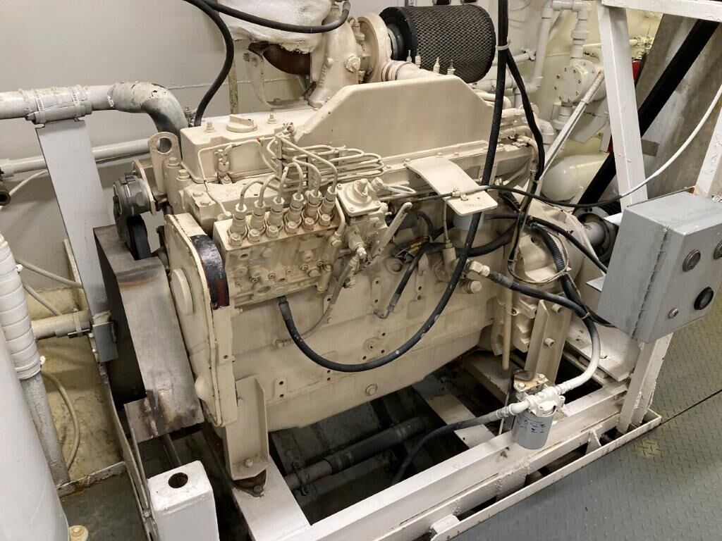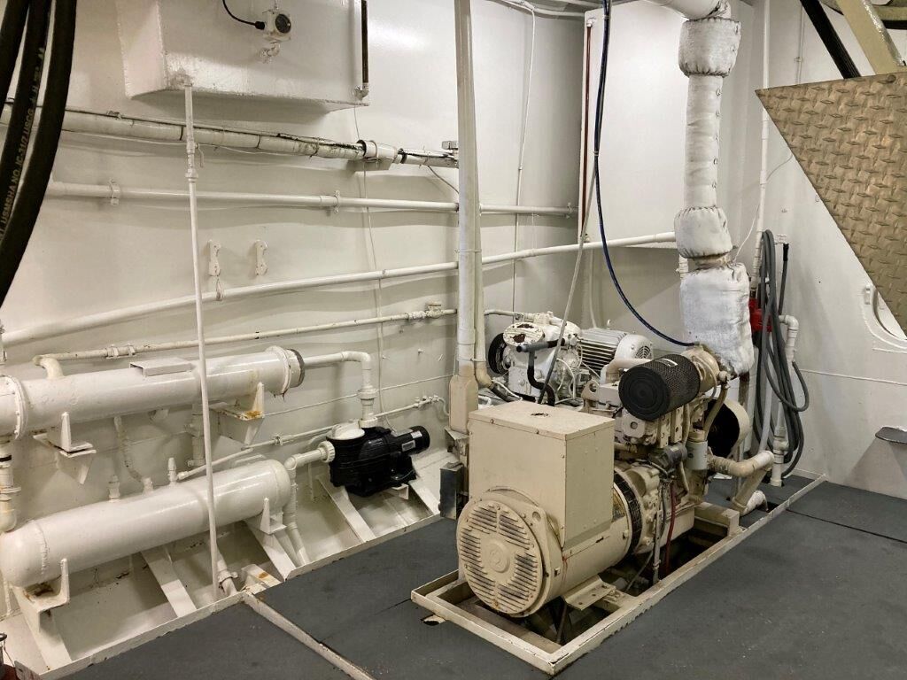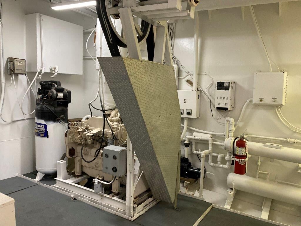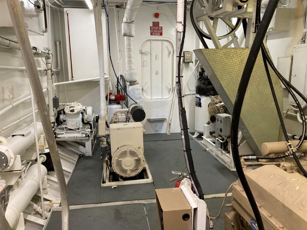 Special Features Include: This Cummins 2,000 houur K19 M3 single screw, diesel powered, refrigerated trawler with deckhouse forward, comes with professional plans and pricing to remove fishing trawls and nets to permit a 40' x 21' (8.400 cu ft.) work area located within the aft deck along with the current freezer set up as seen below. CARGO FREEZER SYSTEM: Vessel is fitted with a 4000 cubic foot 65,000# capacity fully insulated shrimp hold. The cargo freezer system consists of two (2) Carrier model 5F40 compressors each driven by a 20 HP Bal dor 230/460 VAC, 3—phase electric motor. System cooling for each compressor is accomplished by a 1 HP 115/230 VAC, I—phase, 1-1/2" Sta—Rite centrifugal pump through a Standard Refrigeration condenser. An approximate 4000 cubic foot capacity fully insulated shrimp hold is fitted with seven (7) 12' x 2' and one (1) 10' x 2' grade 5086 or 6061 T 6 aluminum evaporator/ chill plates. An 8' x 5' x 4' fiberglass reinforced polyester construction refrigeration brine tank with 3 HP 230/460 VAC, 3—phase motor driven agitator is located on the aft work deck. This Cummins K19 M3 single screw, diesel powered, refrigerated trawler with deckhouse forward, is adaptable to feature a 40' x 21' (8.400 cu ft.) work area located within the aft deck. This vessel was last hauled in August 2021 . During shipyard haulout, the shipyards welder created a hot spot necessitating the following restitutions. This resulted in a major refit of the deckhouse which required demolition of its interior and extensive renewals to include complete wiring, circuit panels, fixtures receptacles, etcetera; electronic & navigation equipment ; plumbing & fixtures; appliances wood work, paneling, cabinets, counters, etcetera and central air conditioning system. Additional work accomplished during 08/2021 haulout included: — All fuel tanks voided, opened, cleaned and gas freed. — New stainless steel fuel lines installed from aft fuel tanks to engine room. Shark cage installed over underwater running gear . Hull near white sand blasted and painted with an epoxy coating system from keel to masthead. — Necessary sacrificial zinc anodes installed.