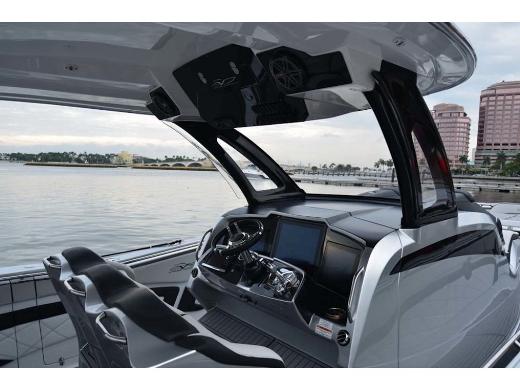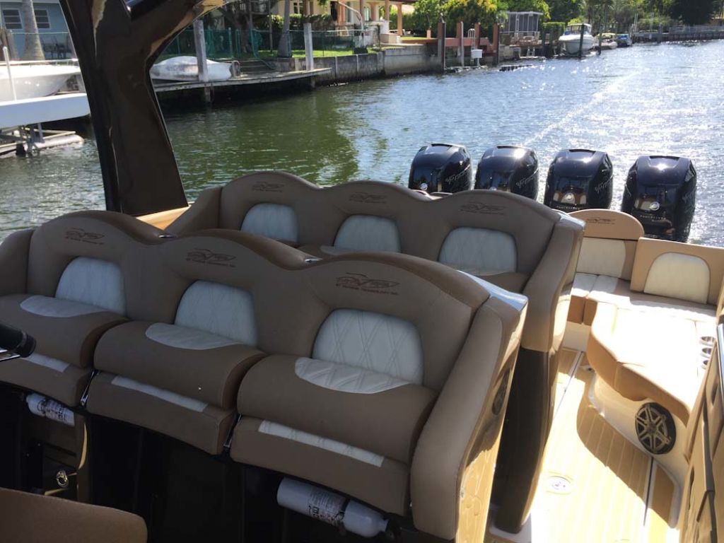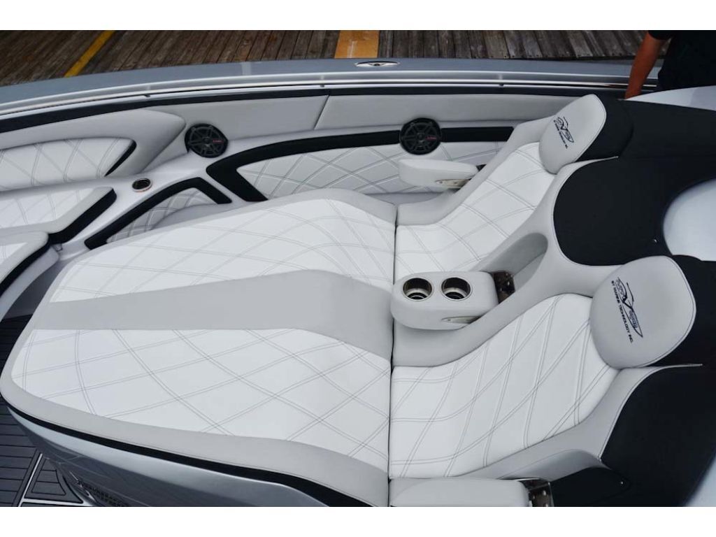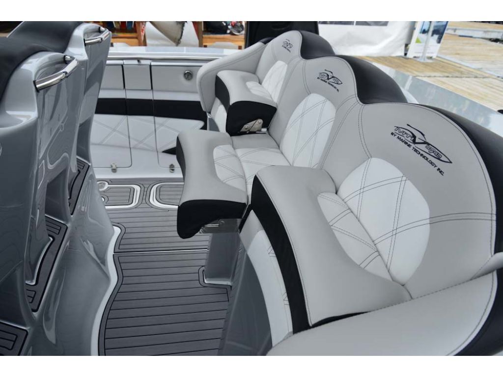 Behind the helm you’ll find two rows of 3 person stand up or sit downs bolsters while the unique hard top is large enough to cover both rows of seats. Going aft there’s a large rear bench.