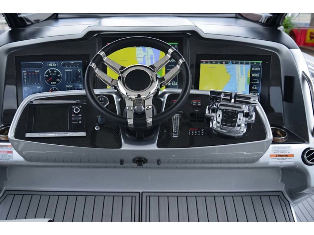 In the cockpit, the area above the central cabin has a front sun lounge that is one of the most comfortable seats on board. The contoured design cradles you comfortably and provides and extra feeling of security at cruising speeds. Moving forward there is U shaped bow seating.